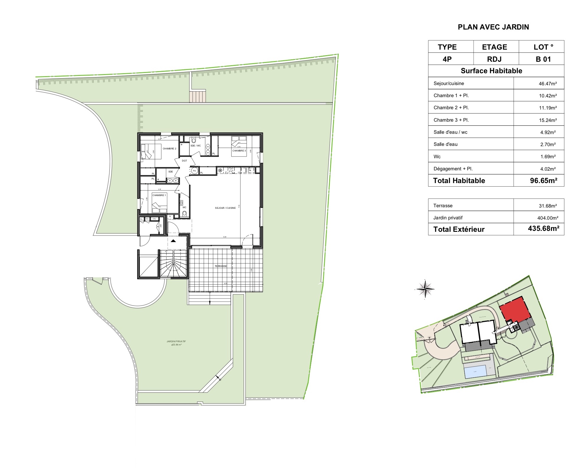 Apartamentos en planta baja , 4 habitaciones, superficie de 100M2 o 122M2, terraza de 16M2 o jardín de 404M2. Orientación sur.